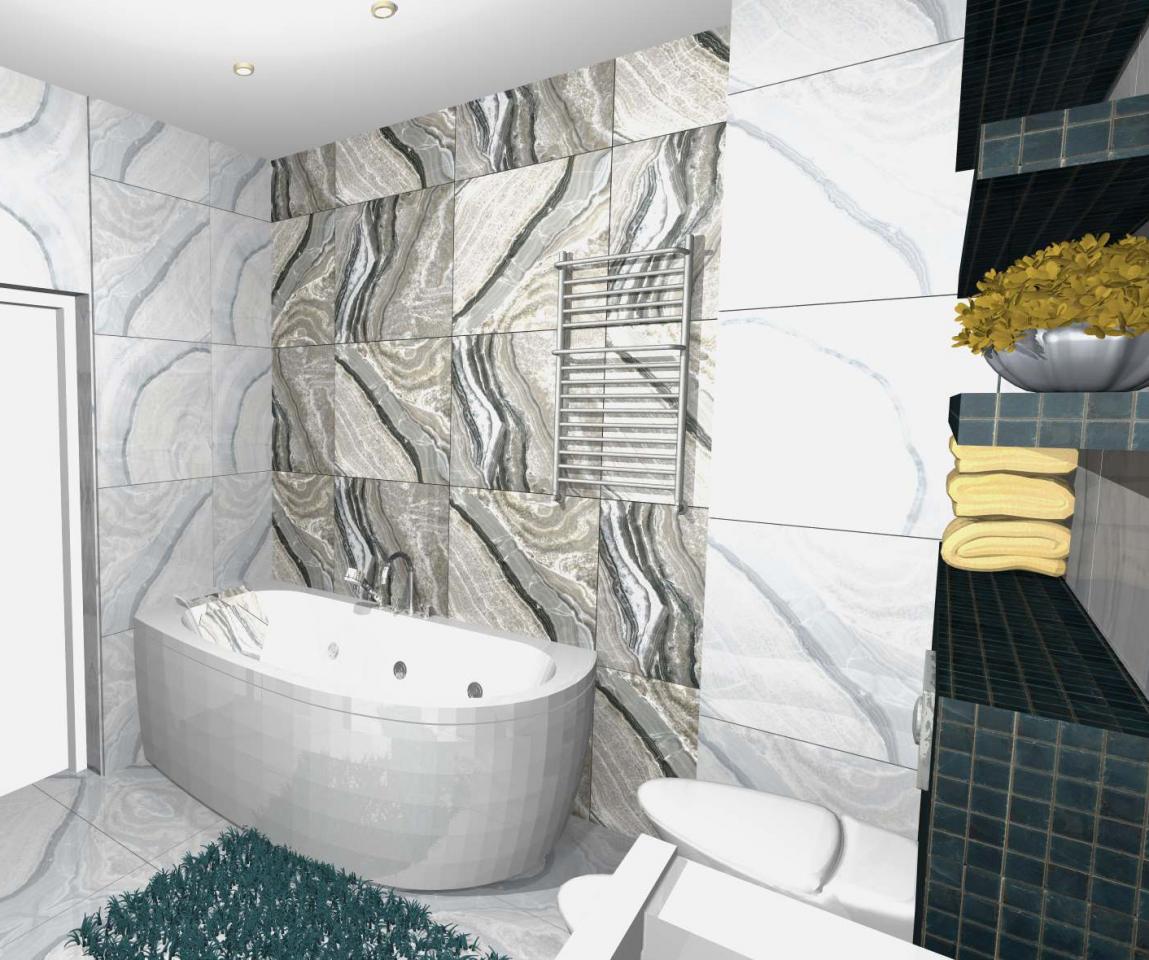 Основной цвет (кроме белого) - цвет морской волны и, к тому же, изображения или даже просто небольшие намёки на волны встречаются по всей квартире. В том числе, заслуживает внимания и яркий акцент в гостиной в виде панно на всю стену из 3Д-панелей с рисунком, имитирующим волны.