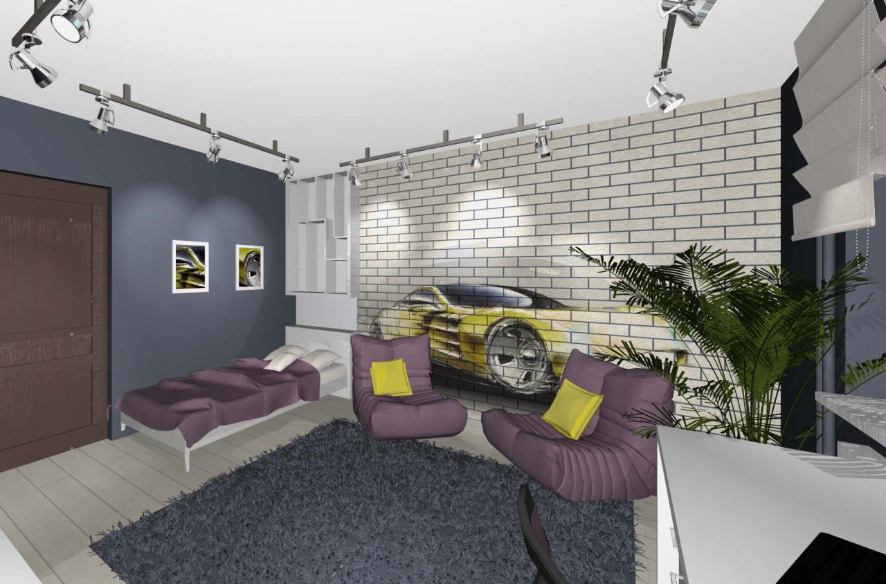 В отличие от зала, комната сына хозяйки квартиры выполнена в молодёжном стиле с элементами лофта (открытая кирпичная кладка).