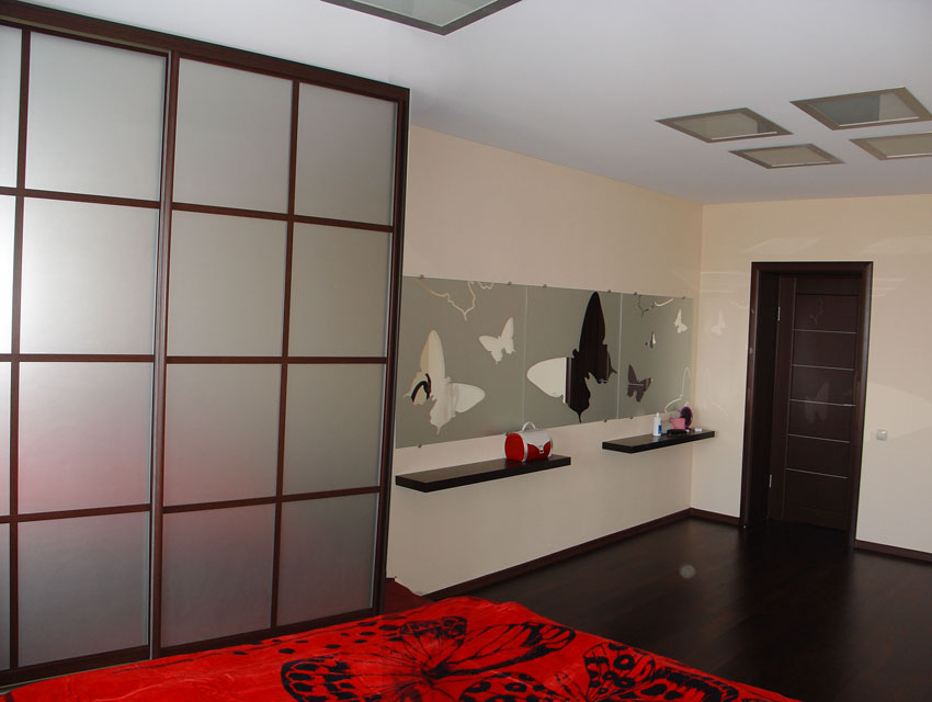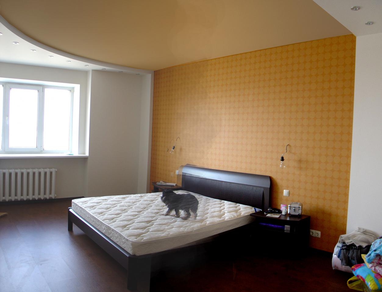 Так же оранжевым цветом была отделана и стена у изголовья кровати в спальне.