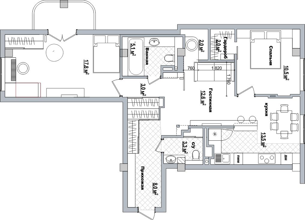 Как часто бывает в нашей работе, в данном проекте также была произведена перепланировка. На этот раз двухкомнатная квартира была превращена в трёхкомнатную, причём довольно просторную. Одна из интересных особенностей квартиры - её полная звукоизоляция. Так как дочка хозяйки квартиры серьёзно занимается музыкой, мы применили капитальную звукоизоляцию и по стенам, и по полу с потолком.