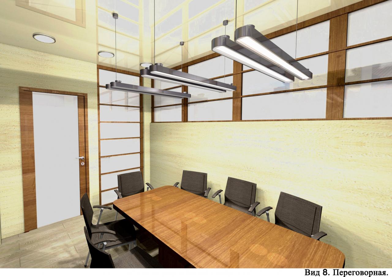 Переговорная комната не имеет собственных окон. Поэтому, чтобы сделать её светлой в дневное время суток без искусственного освещения, часть перегородки, которая отделяет переговорную от смежной с ней комнаты, остеклена и пропускает дневной свет.