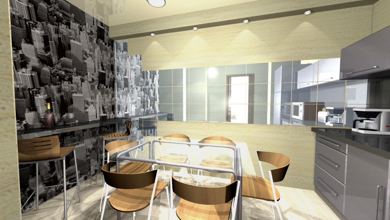 Использованные дизайнером зеркала, большое графическое панно и другие элементы позволили визуально расширить крохотную офисную кухню-столовую.